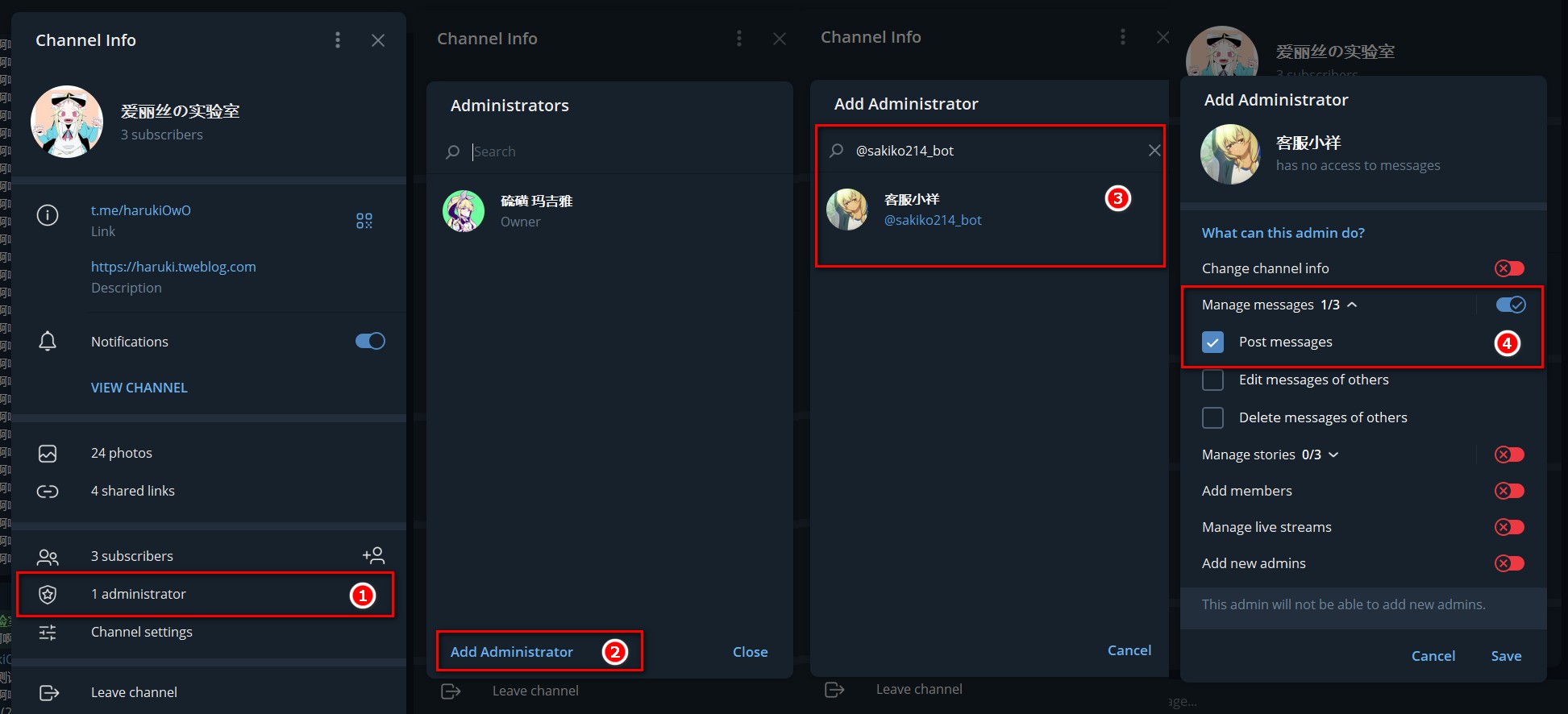 以下是加入频道的过程,搜索刚刚创建的机器人的用户名,来将其作为管理员加入频道,只给发送帖子权限即可