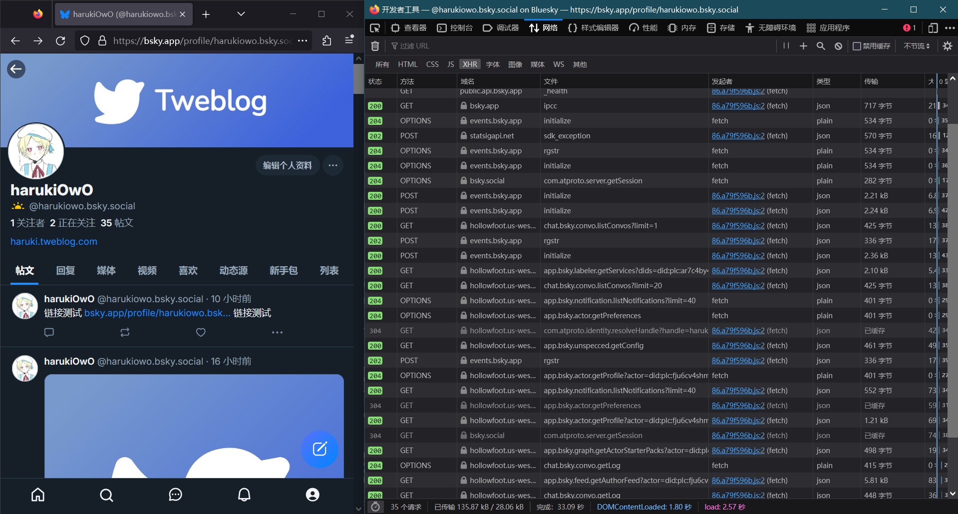 在 bluesky 网页中,进入自己的个人资料,按 F12 打开开发者工具,然后刷新页面。