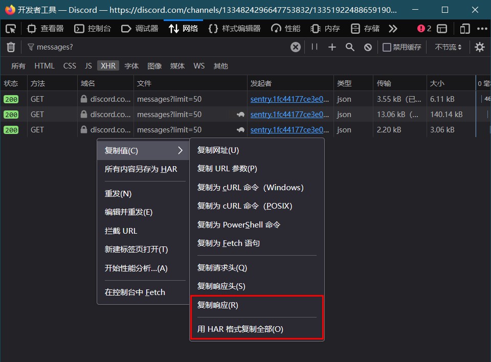 右键点击对应请求 复制响应 即可获取本请求所包含的数据。也可以在任意一条上右键点击并 用 HAR 格式复制全部 ,即可获取全部数据。