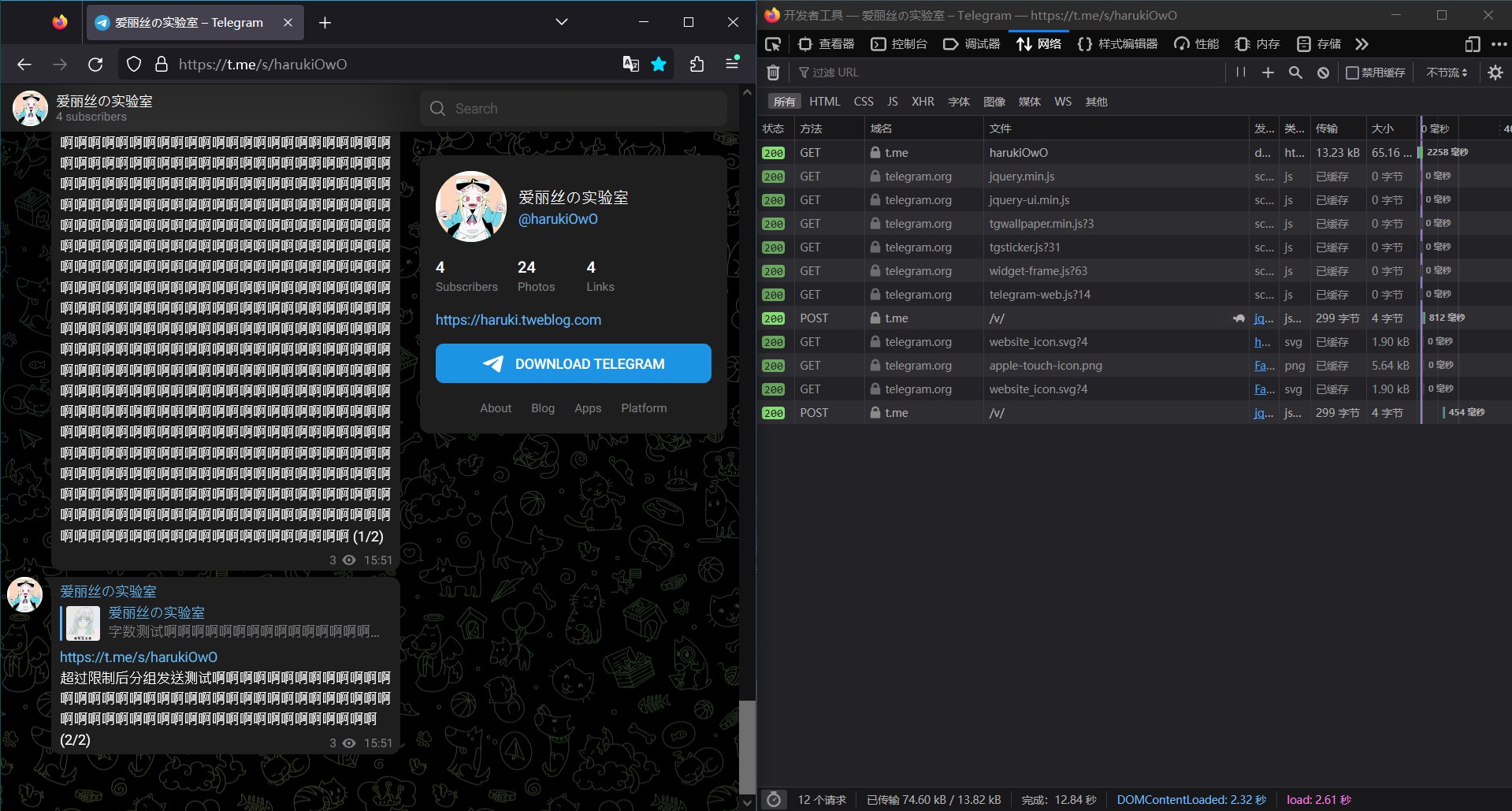 在 Telegram 频道网页中,按 F12 进入开发者工具,然后刷新页面。