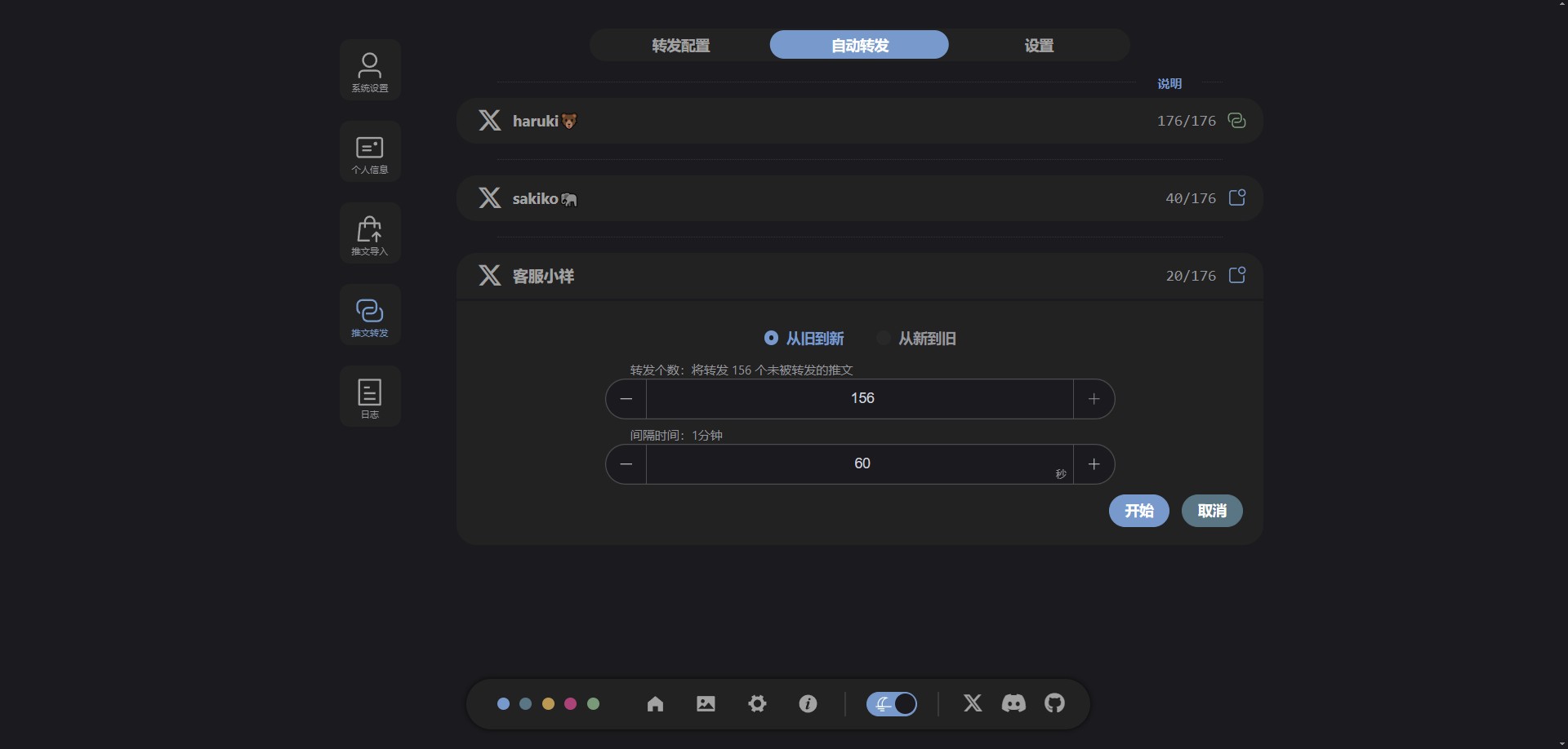 - 关于转发个数 在顺序为 从新到旧 时启动后,在任务中显示的个数可能会比之前指定要多,这是正常现象